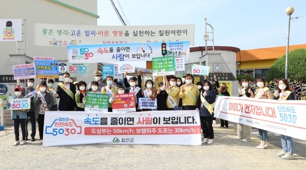 [국회의정저널] 함안군은 지난 28일 칠원읍 소재 칠원초등학교 앞에서 조근제 함안군수를 비롯한 정상율 함안교육장, 함안경찰서 차유미 칠원초등학교장, 녹색어머니회, 학생자치회 등 40여명이 참여한 가운데 ‘안전속도 5030’ 홍보 캠페인을 실시했다.