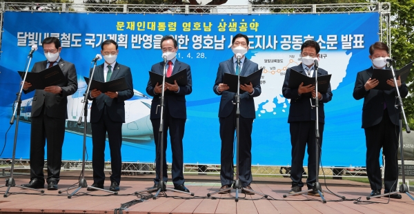 이어 “이 사업은 단순히 광주와 대구만을 잇는 철도가 아니라 전남, 전북, 경남, 경북 등 6개 광역 자치단체를 거쳐가고 관련 거주 인구만 해도 970만에 이른다”며 “국토균형발전과 동서화합을 위해 각별히 노력해 온 대통령이 결단해 달라”고 호소했다.