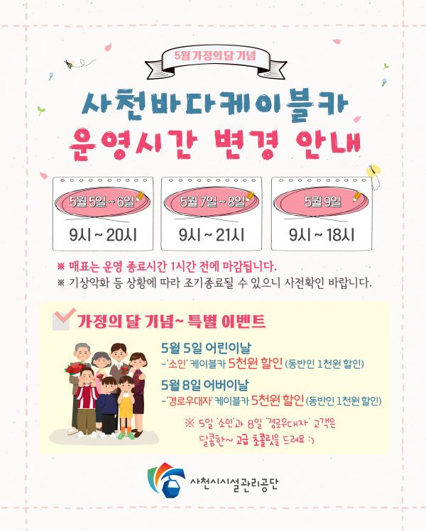 [국회의정저널] 사천시시설관리공단이 5월 가정의 달을 맞아 온 가족이 함께 포근한 봄을 느끼며 안전하고 즐거운 여행을 즐기기 바라는 마음으로 다양한 이벤트 행사를 준비했다고 29일 밝혔다.