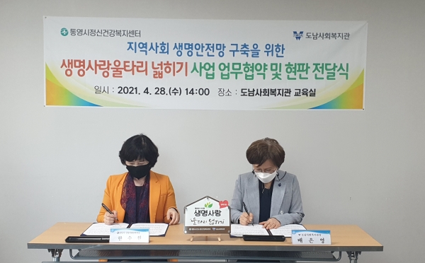 [국회의정저널] 통영시는 도남사회복지관과 함께 지역사회 생명안전망 구축을 위한 생명사랑울타리 넓히기 사업 업무협약 및 현판전달식을 28일 도남사회복지관에서 개최했다.