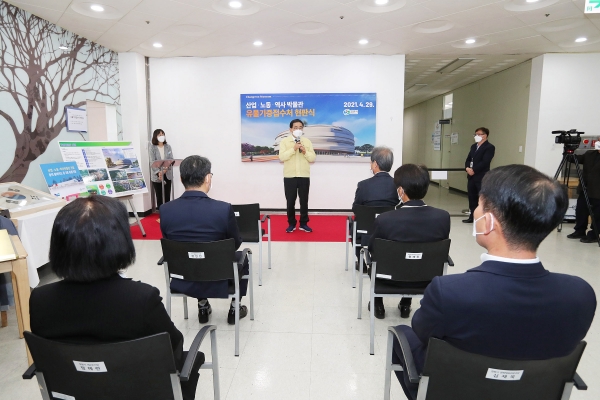 이어 진행된 유물 기증식에서는 창원시에 본사를 두고 있는 국내 대표 친환경 에너지 발전 기업인 두산중공업이 풍력발전기 블레이드 1점과 풍력터빈, 가스터빈 모형 각 1점 등 총 3점을 기증했다.