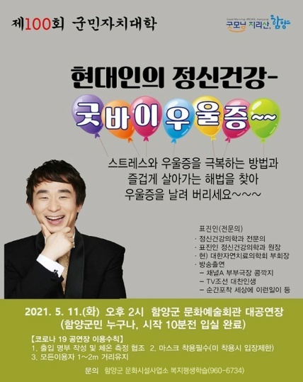 코로나로 인해 지난해 연기된 바 있는 제100회 군민자치대학은 코로나로 심신이 지친 모두에게 정신건강 교육을 통한 육체적, 정신적 건강회복의 기회 제공을 위해 ‘현대인의 정신건강’을 주제로 다시 진행한다.