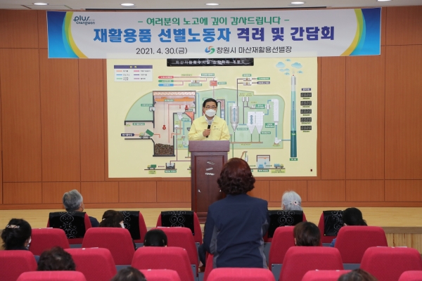 [국회의정저널] 창원시는 제131주년 세계 노동절을 앞두고 30일 오전 11시20분 마산합포구 진동면 마산재활용선별장을 방문해, 코로나19 이후 급증한 재활용품을 선별하는 현장을 직접 찾아 현장 소통 간담회를 가졌다고 밝혔다.