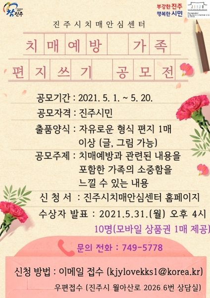 공모전 접수는 5월 1일부터 20일까지이며 진주시와 진주시치매안심센터 홈페이지에서 신청서를 다운받아 작성해 자유로운 형식의 편지와 함께 이메일 또는 우편으로 접수하면 된다.