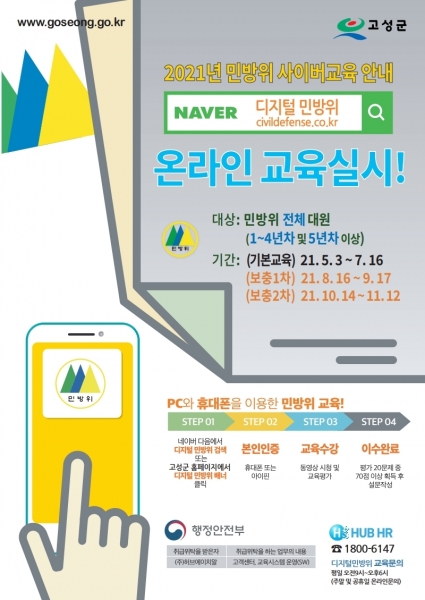 교육 일정은 5월 3일부터 7월 16일까지이며 고성군청 홈페이지 배너를 통해 접속하거나 또는 디지털민방위 홈페이지로 직접 접속한 뒤, 본인인증을 거쳐 1시간의 교육을 수강하고 평가를 마치면 올해 교육 이수를 완료하게 된다.