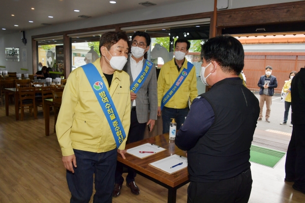 김일권 양산시장은 이날 양산시 북정동 일대 식당 14개소 등을 방문해 출입자 명부 작성,마스크 착용, 사회적 거리두기, 온도측정, 소독·환기 실시 등 방역수칙 이행 여부를 중점적으로 점검했다.