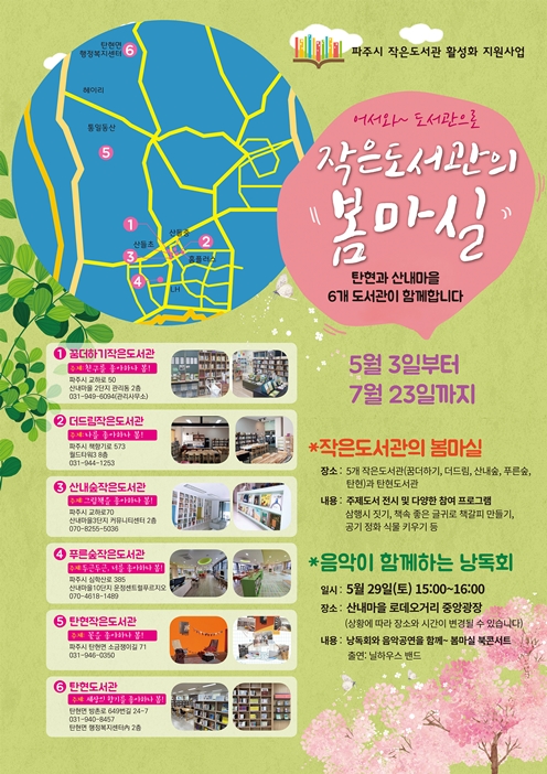 [국회의정저널] 파주시 탄현도서관은 5월 3일부터 7월 23일까지 작은도서관 활성화 지원의 일환으로 5개소의 작은도서관과 협력해 ‘작은도서관의 봄마실’을 운영한다.