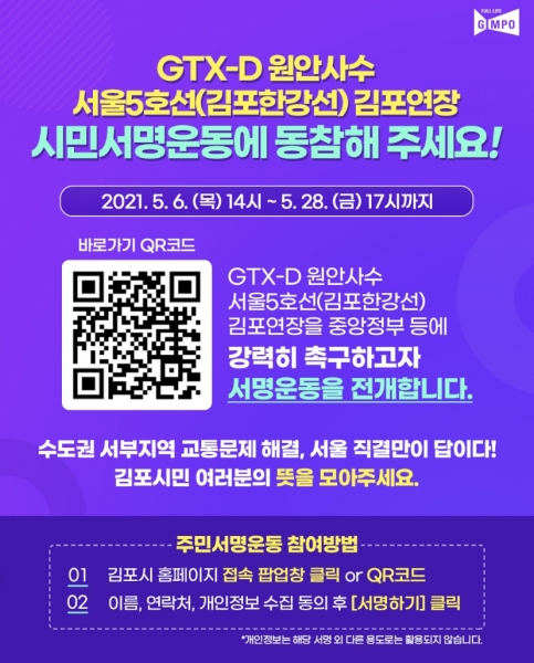 [국회의정저널] 김포시가 GTX-D 원안 사수, 서울5호선 김포연장을 위한 온·오프라인 시민 서명운동에 돌입한다.