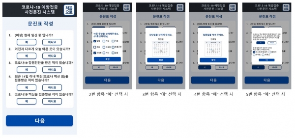 예진표 작성화면도 질문 문항별로 화면이 전환되도록 만들어 글자가 크고 질문도 간단하다.