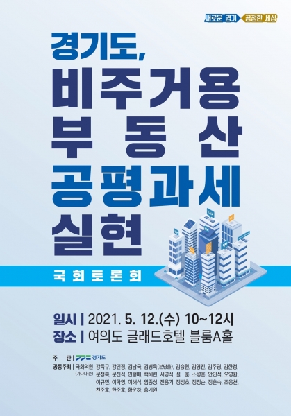 [국회의정저널] 경기도는 오는 12일 오전 10시 서울 여의도 글래드 호텔에서 이재명 경기도지사와 국회의원, 민간전문가가 함께하는 ‘경기도, 비주거용 부동산 공평과세 실현’ 정책토론회를 개최한다고 7일 밝혔다.