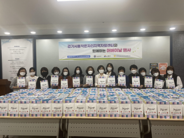 선물꾸러미는 카네이션과 KF94 마스크, 영양떡, 생활용품으로 준비했으며 사회복지법인 복음자리, ㈜작은자리돌봄센터, 노인맞춤돌봄 경기광역센터에서 마스크와 생활용품, 카네이션을 후원했다.