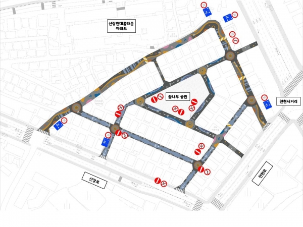 이에 시는 6억원을 투입해 꿈나무공원 일대 약 5,277㎡ 구간에 차량 일방통행로 디자인 도막 포장 측구 및 보차도 경계석 교체 LED 도로표지병 등 보행자 안전 확보를 위한‘교통정온화 시설 보행자의 안전 확보 등을 위해 자동차의 속도나 통행량을 줄이는 시설’을 설치한다.
