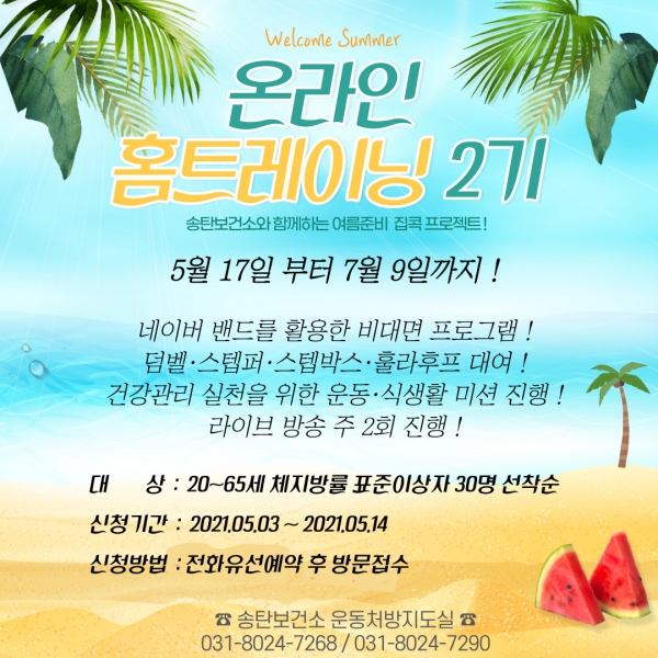 온라인 홈트레이닝 프로그램은 20 ~ 65세 체지방률 표준이상자 30명을 대상으로 5월 17일부터 7월 9일까지 8주간 운영되며 네이버밴드를 활용해 실시간 라이브 방송, 운동영상 및 영양, 구강건강관리 자료를 게시하고 대상자의 운동참여를 유도 할 운동기구 대여 서비스, 운동 미션 인증 등 비만관리를 위한 통합적 서비스를 제공 할 계획이라고 전했다 지난 1기 참여자 중 80% 이상이 스스로 규칙적인 운동을 실천하게 됐고 70%이상은 체지방률의 감소를 보였으며 프로그램 만족도가 높게 나타났다.