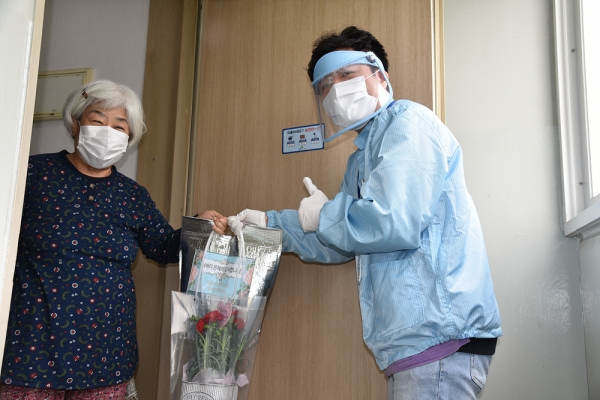 모든 전달은 복지관 직원들이 방역수칙을 준수해 어르신 댁으로 방문했으며 카네이션을 전하며 어르신들의 건강과 안녕을 함께 기원했다.