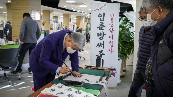 이날 이정일 작가가 재능기부로 참여해 주민을 대상으로 ‘입춘대길’과 ‘건양다경’ 등 글귀를 써줬다.